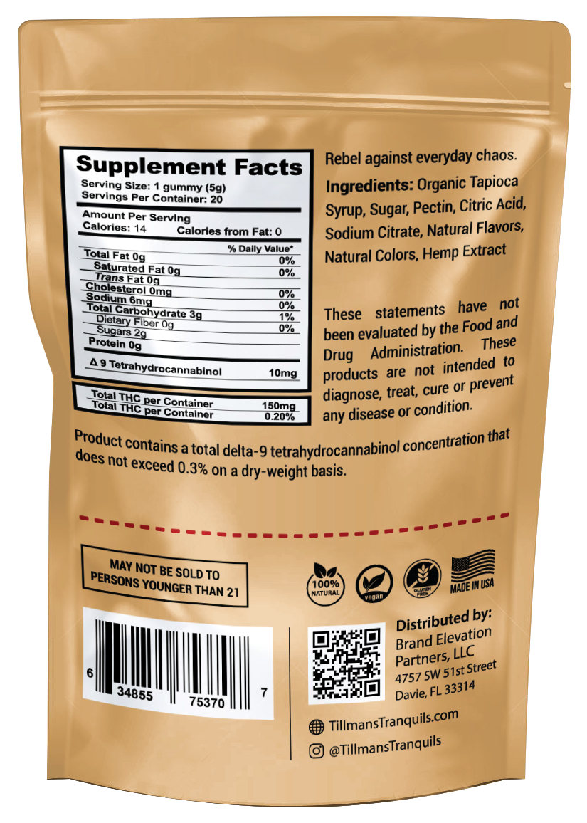 The 2018 farm bill that legalized hemp stated that hemp must contain less than 0.3% Delta 9 THC by dry weight. Our gummies weigh 5 grams which means we can legally have up to 15mg of Delta 9 THC per gummy.