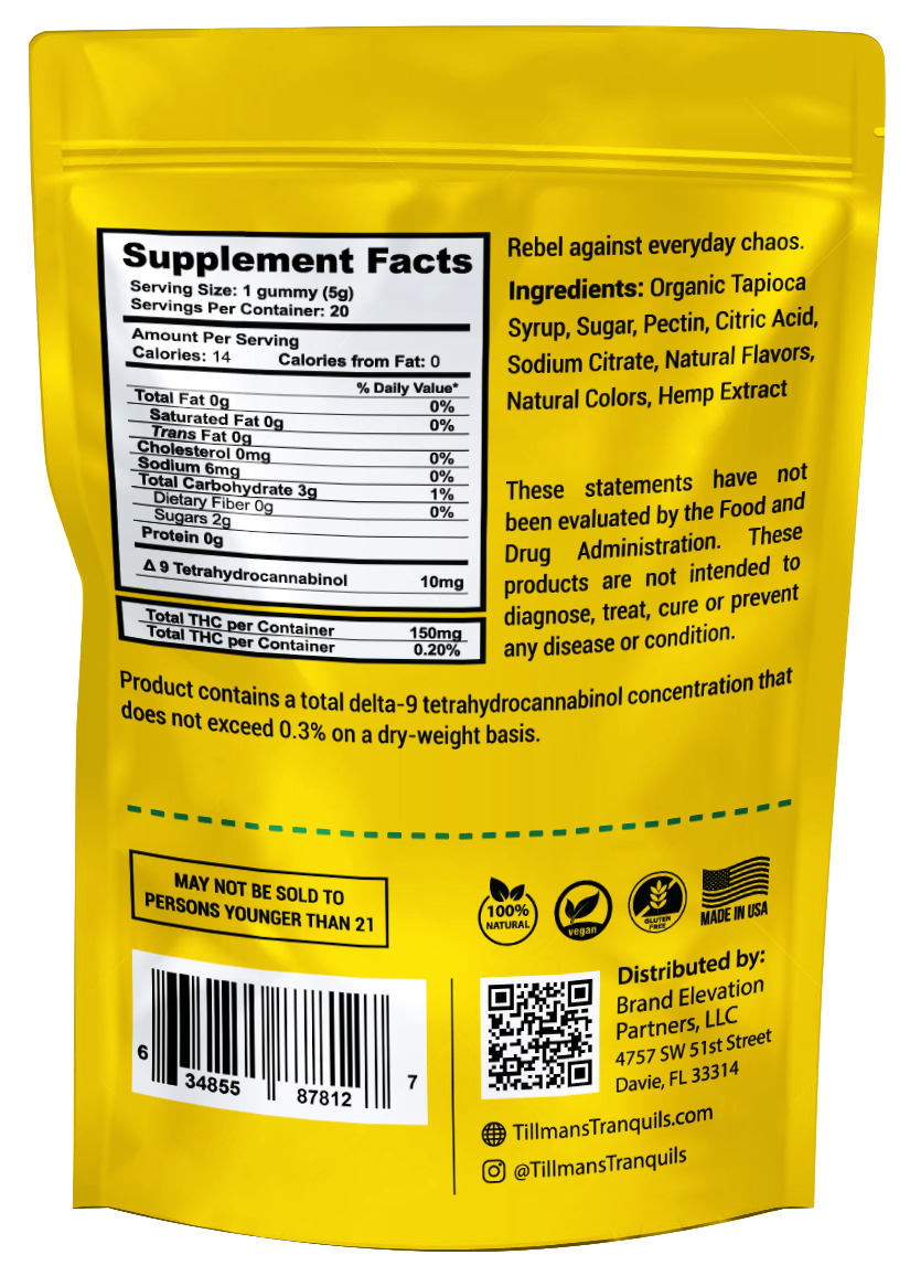 The 2018 farm bill that legalized hemp stated that hemp must contain less than 0.3% Delta 9 THC by dry weight. Our gummies weigh 5 grams which means we can legally have up to 15mg of Delta 9 THC per gummy.